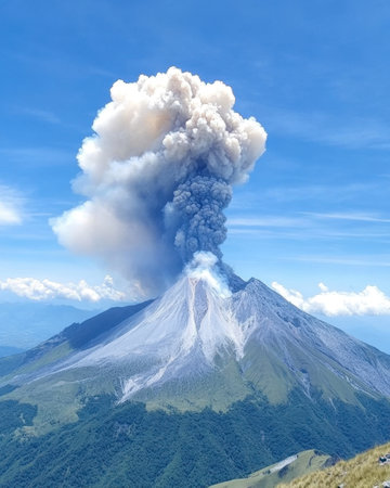 The majestic volcano erupts, sending plumes of ash and mineral-rich clouds into the bright blue sky above the verdant terrain.