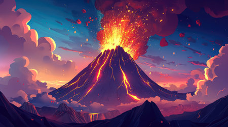 A powerful volcano erupts spectacularly, spewing fiery lava and creating a dramatic scene filled with smoke and vibrant colors against a dark sky.