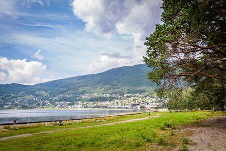 Norwegian landscape. Green mountains hills and fjord, stormy rainy weather.