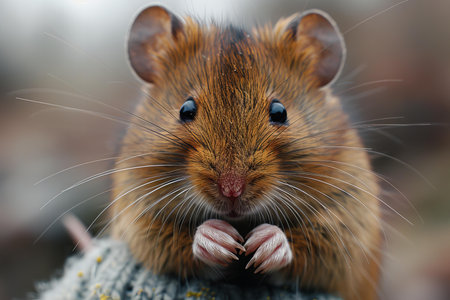 A detailed portrait of a small, inquisitive brown rodent with glistening eyes and prominent whiskers, quietly observing from a sleek, polished surface against a gent