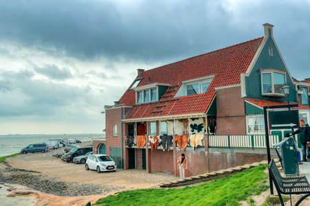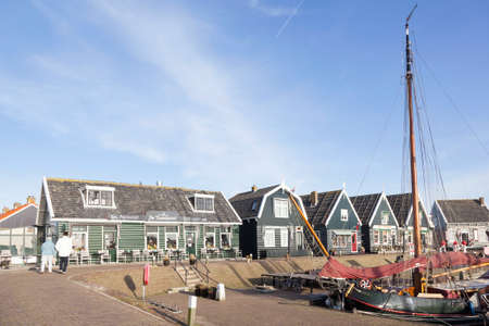VOLENDAM, NORTH HOLLAND, NETHERLANDS - MARCH 3, 2019: Typical Dutch village shop-house in the Volendam harbor. Marina and waterfront of Volendam.