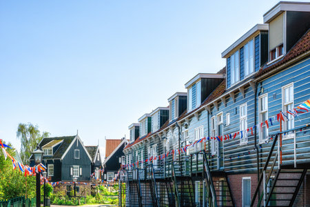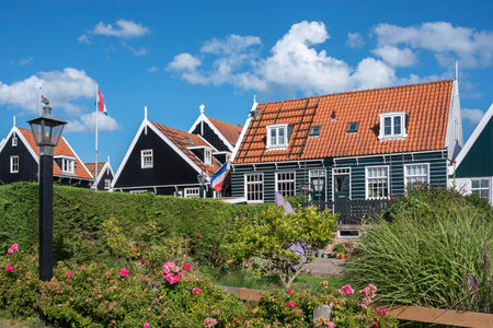 Marken, Netherlands - April 26, 2022: Beautiful typical fisherman village houses in Marken island Waterland, Netherlands.