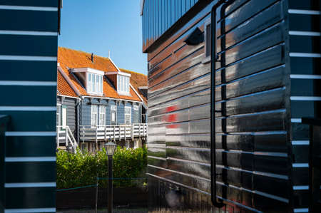 View of the Marken town center with backyards of traditional wooden houses at the Rietland street on a sunny afternoon. North Holland, The Netherlands