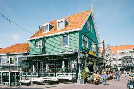 Volendam, Netherlands - May 14, 2019: typical Dutch pub with people sitting outdoors overlooking the marina of Volendam