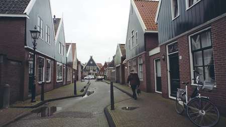 Walking on sunny spring day in small Dutch town Marken with wooden houses located on former island in North Holland, Netherlands
