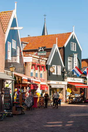 View of historical, traditional houses and people walking in Volendam. It is a Dutch town, northeast of Amsterdam. It’s known for its colorful wooden houses and the old fishing boats.