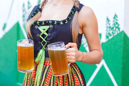 Beautiful waitress in traditional german costume holding beer glass in the bar.