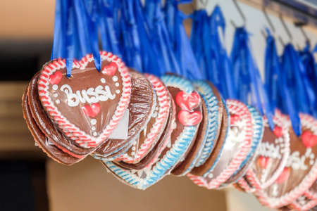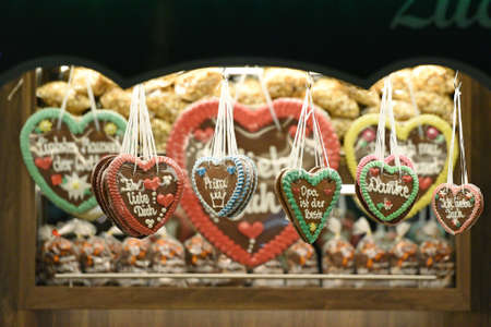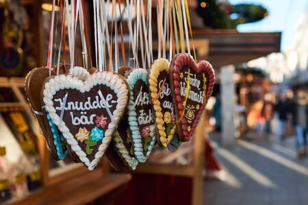 Gingerbread Hearts at German Christmas Market. Nuremberg, Munich, Fulda, Berlin, Hamburg xmas market in Germany. In German language I love you.