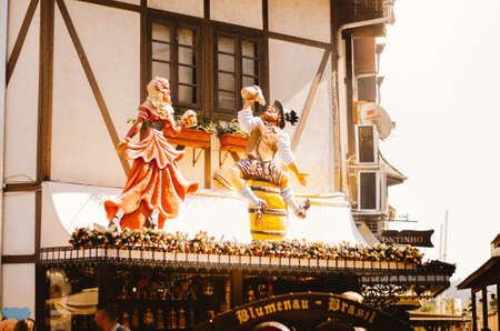 MUNICH, GERMANY - SEPTEMBER 23, 2014: The Oktoberfest in Munich is the biggest beer festival of the world. The visitors have lot of fun with many amusement huts and shops for food, gifts and souvenirs.