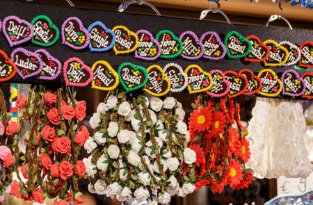 Munich, Germany - September 26, 2015: Sales stall at Oktoberfest with small hearts saying for example