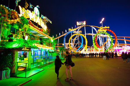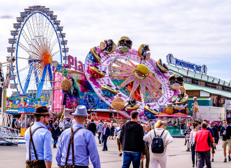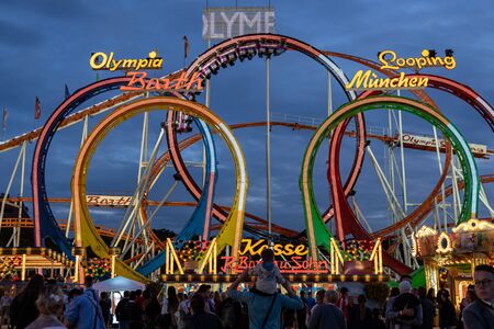 Munich, Germany - September 30: people and fairground rides at the biggest folk festival in the world - the oktoberfest on september 30, 2018 in munich.
