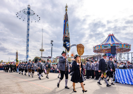 Munich, Germany - October 2019: The traditional marksmen parade with brass bands on the last day of the Oktoberfest. 60 shooters shoot a salute at the foot of the Bavaria statue on October 6, 2019 in Munich