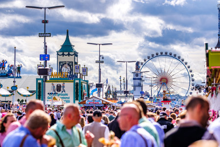 Munich, Germany - September 28: visitors, beertents and fairground rides on the oktoberfest in munich at September 28, 2019