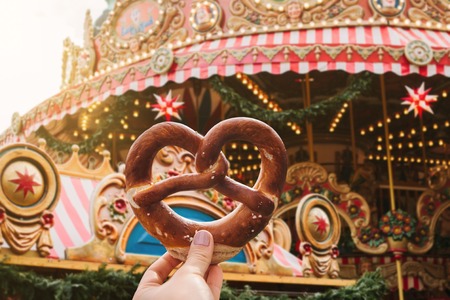 The girl is holding a traditional German pretzel. Carousel or merry-go-round and celebration in the background.