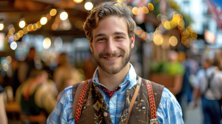 Oktoberfest, portrait of a happy handsome German male waiter, plaid shirt and suspenders, blurred background, outdoor evening bar