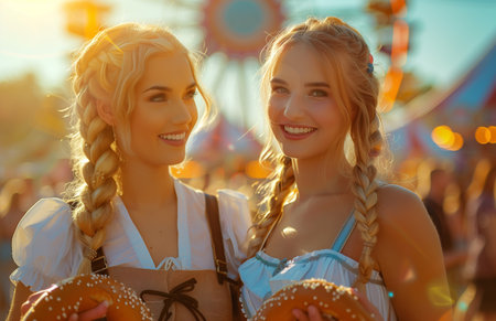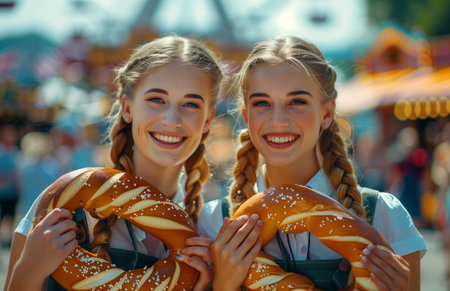 Two women in Bavarian outfits holding pretzels, standing opposite on an orange fairground street, smiling warmly
