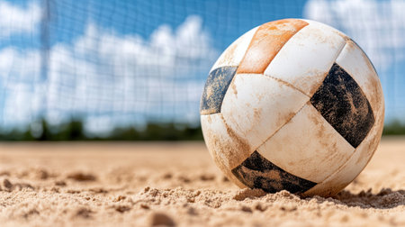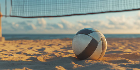 close-up shot of a volleyball on sandy beach with net in the background, created with generative ai