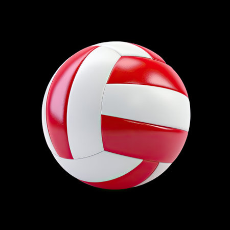This close-up image showcases a red and white volleyball resting on a black background, ideal for representations of sports, fitness, and athletic activities.
