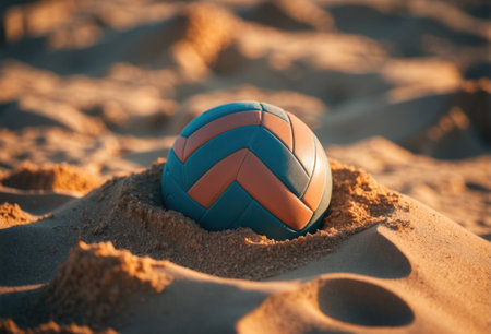 A stunning beach volleyball scene featuring a well-used ball resting on soft sand under a vibrant sunset, emphasizing the joy of outdoor sports and friendly competition.