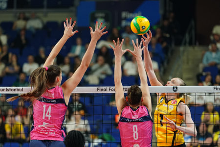 ISTANBUL, TURKIYE - MAY 04, 2025: Hena Kurtagic and Alessia Orro in action during Vero Volley Milano vs Vakifbank CEV Champions League Volley Final Four Bronze Medal match in Ulker Sports Arena