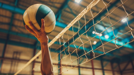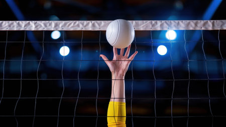 This striking image captures a volleyball player's hand reaching for the ball above the net, showcasing the intense action and focus of the sport under bright arena lights.