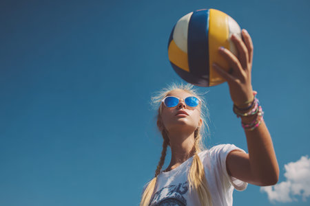 Young girl prepares to serve a volleyball under a clear blue sky at a beach during a sunny day with friends