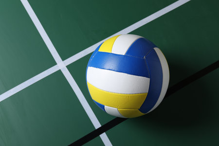 A vibrant volleyball rests atop colorful team jerseys in an indoor gym, showcasing preparation for a thrilling match with players ready in the background.
