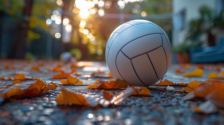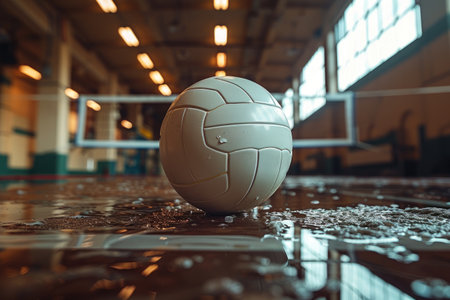 A volleyball rests on a polished wooden court, bathed in soft, filtered light streaming indoors