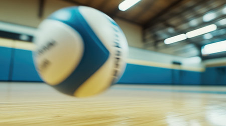 A close-up of a volleyball bouncing on a wooden court with motion blur.