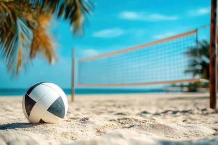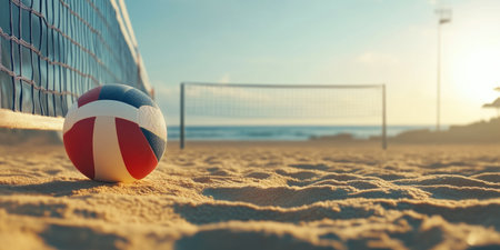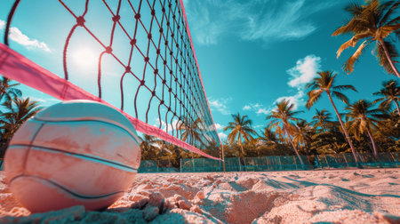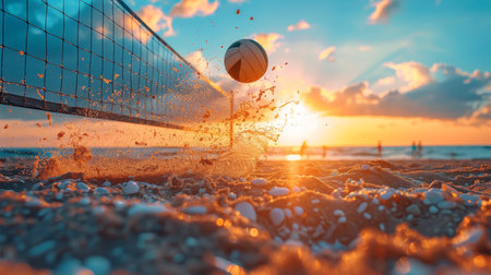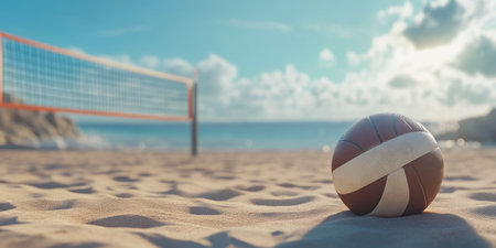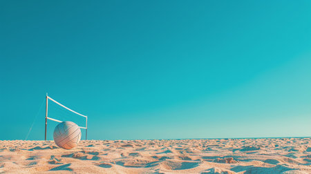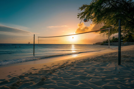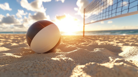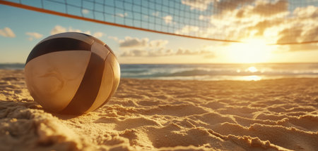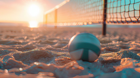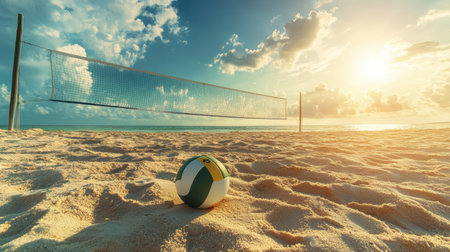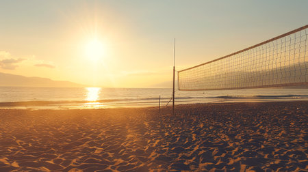 A serene beach scene featuring a volleyball and net at sunset, ideal for capturing the essence of summer fun, sports, and leisure by the sea with vibrant colors.