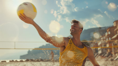 Volleyball on the beach. A handsome athletic man in a sports uniform is playing volleyball on the beach, smiling and holding a yellow ball in his hands. The scene is bright and cheerful, the sun is shining on the beach, and the man is enjoying the game.
