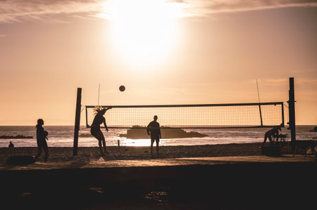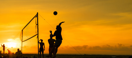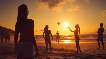 A vibrant beach scene capturing silhouetted volleyball players in action during a stunning sunset. The golden light reflects on the ocean waves, enhancing the serene atmosphere.
