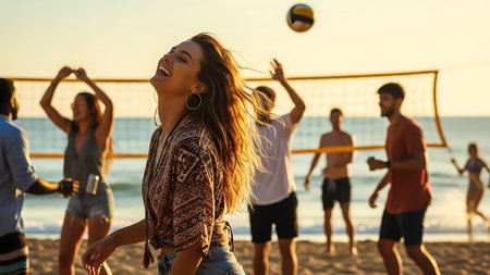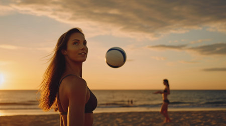 Beautiful girl close-up view in a sand beach volleyball game at sunset. Summer tropical vacation concept. AI generated.