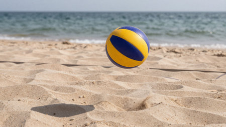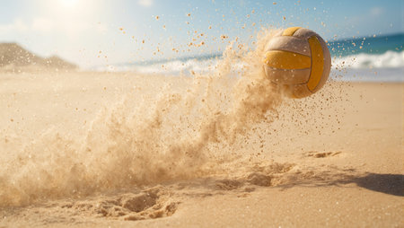 Dynamic beach volleyball in flight sand particles glistening in the sun