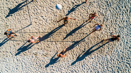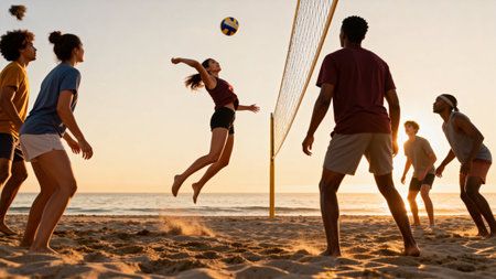 Group of People Engaged in a Game of Volleyball, Sweat-drenched athletes playing volleyball under a scorching summer sun, AI Generated