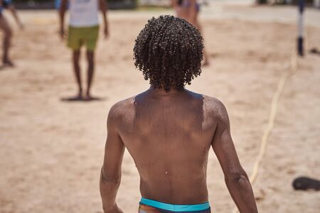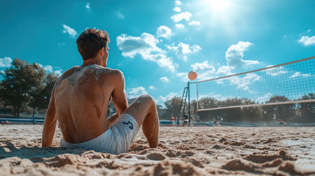Relaxed beach volleyball player on sand court, sunny day, people playing in background