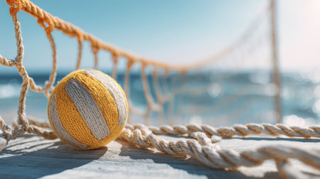 A close view of a vibrant yellow and white knitted ball resting near a beach volleyball net, with a beautiful ocean backdrop and sunny sky.