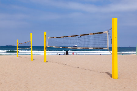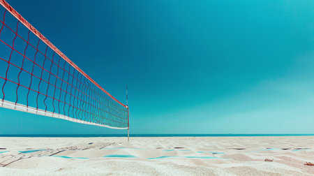 A tranquil beach setting featuring a volleyball net with soft sand, sunny sky, and sparkling ocean waves, perfect for capturing the joy of summer activities and relaxation.