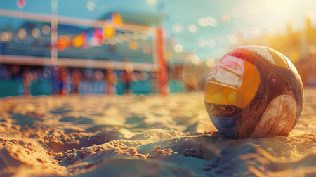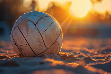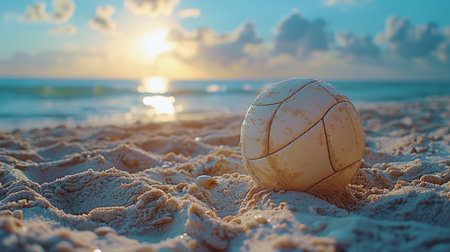 Sunset Beach Volleyball Scene in Warm Light. Close-up beach volleyball rests in the sand, with the setting sun casting a warm, golden glow on the scene.