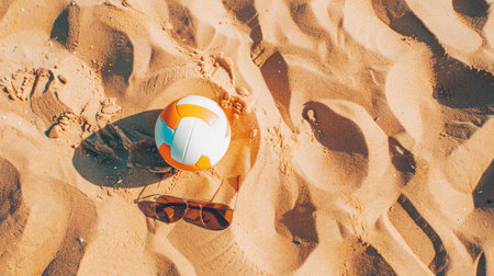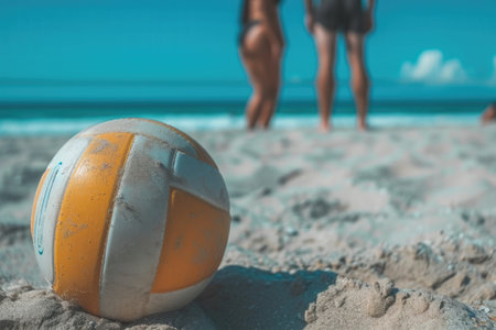 A worn volleyball lies on the sun-kissed sands of a tranquil beach, surrounded by the vast blue of the ocean. The sky stretches overhead, revealing a perfect day for fun in the sun, evoking memories of laughter and camaraderie.