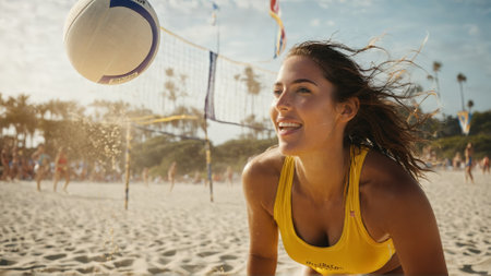 Happy woman playing beach volleyball sand spraying ball soaring competitive spirit Cinematic portrait photography capture