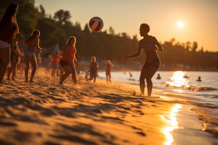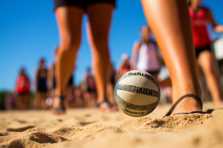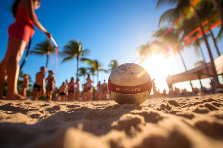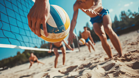A beach volleyball game in progress with a volleyball in the foreground and players enjoying the sun and sand. High quality photo
