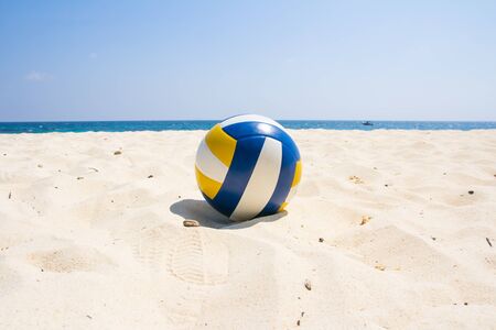 Volleyball ball on empty beach against blue sky and turquoise ocean. Summer.
