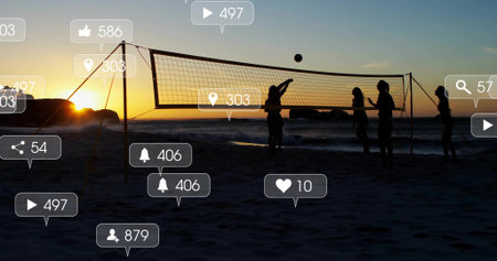 Group of friends playing beach volleyball on the beach at sunset. Selective focus