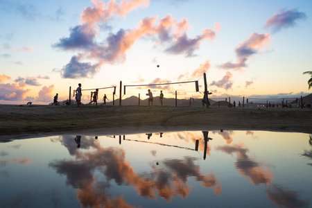 Silhouettes playing beach volleyball at sunset in Santos, with colorful clouds reflected in a calm water puddle on the sand. Scenic and dynamic coastal scene.