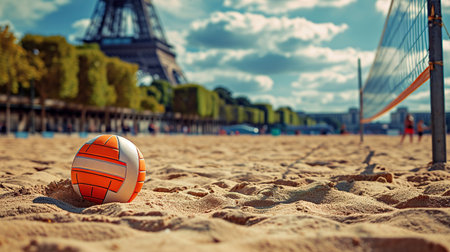 Close-up of an orange volleyball on sandy court in Paris, with Eiffel Tower in the background, Summer Olympics in 2024