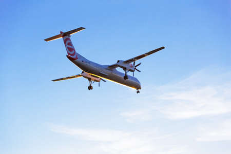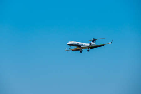Victoria, Vancouver Island, British Columbia, Canada - August 25, 2021: Commercial Airliner airplane landing at the Airport during a sunny summer day.