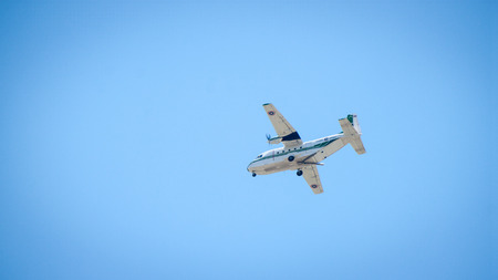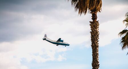 Faro, Portugal - May 1, 2018: Aerov Airlines Antonov An-12 A plane on approach to Faro International Airport on a spring day
