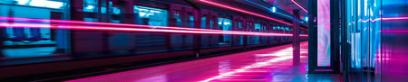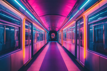 A captivating view of a futuristic subway tunnel featuring vibrant neon lighting and curved tracks. This modern architectural design evokes a sense of motion and energy.