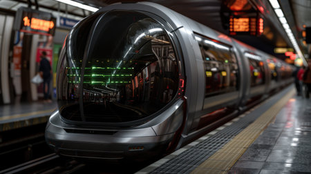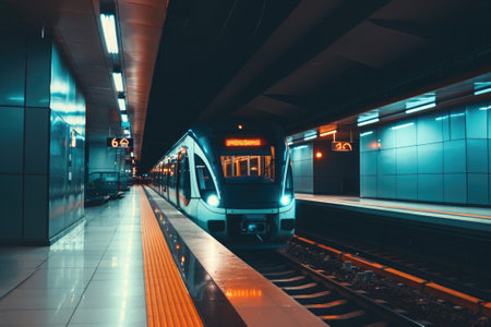 sleek, modern metro train arrives at a well-lit, futuristic underground station